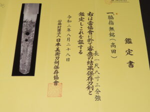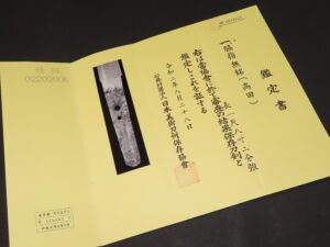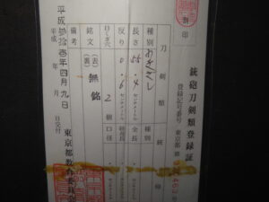 Hand forged samurai blades are registered in the Agency for Cultural Affairs as artwork and The Board of Education (Cultural properties protection Committee); therefore each sword has the registration card, issued by the Board of Education.