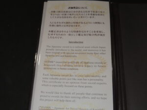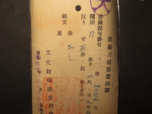 Hand forged samurai blades are registered in the Agency for Cultural Affairs as artwork and The Board of Education (Cultural properties protection Committee); therefore each sword has the registration card, issued by the Board of Education.