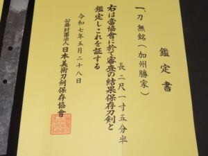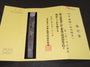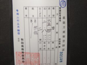 Hand forged samurai blades are registered in the Agency for Cultural Affairs as artwork and The Board of Education (Cultural properties protection Committee); therefore each sword has the registration card, issued by the Board of Education.