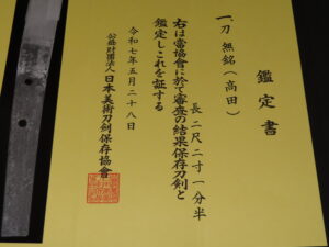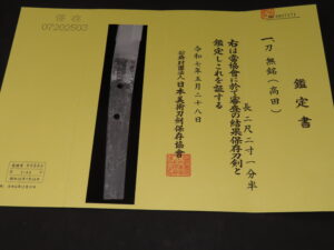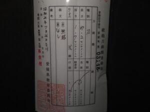 Hand forged samurai blades are registered in the Agency for Cultural Affairs as artwork and The Board of Education (Cultural properties protection Committee); therefore each sword has the registration card, issued by the Board of Education.