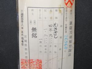Hand forged samurai blades are registered in the Agency for Cultural Affairs as artwork and The Board of Education (Cultural properties protection Committee); therefore each sword has the registration card, issued by the Board of Education.