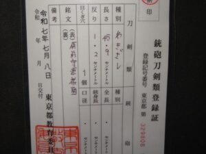 Hand forged samurai blades are registered in the Agency for Cultural Affairs as artwork and The Board of Education (Cultural properties protection Committee); therefore each sword has the registration card, issued by the Board of Education.