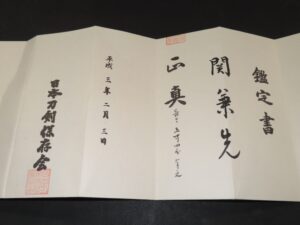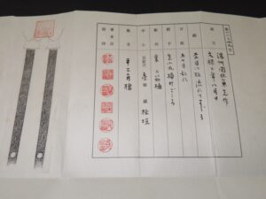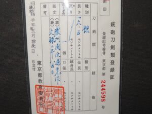 Hand forged samurai blades are registered in the Agency for Cultural Affairs as artwork and The Board of Education (Cultural properties protection Committee); therefore each sword has the registration card, issued by the Board of Education.